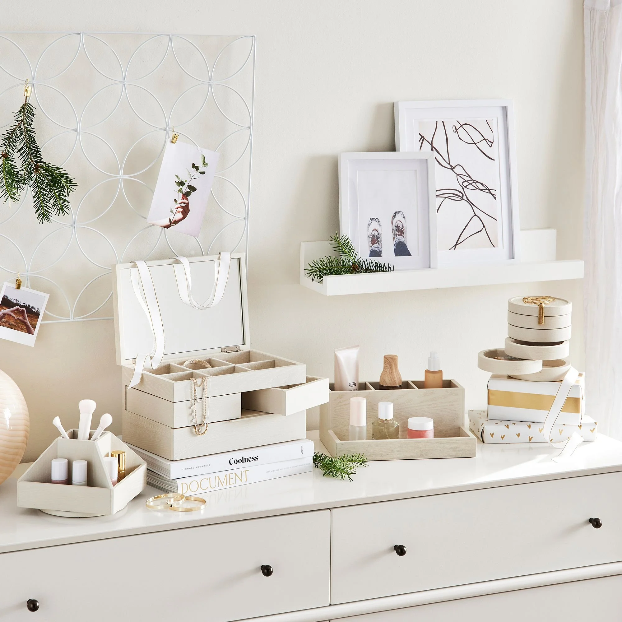 Jewelry & Beauty OrganizationBeauty and jewelry storage in a broad range of aesthetics, from classic to glam, traditional to modern. Materials include metal, marble, wood, acrylic, mirrored glass, cast resin, leather and fabric.